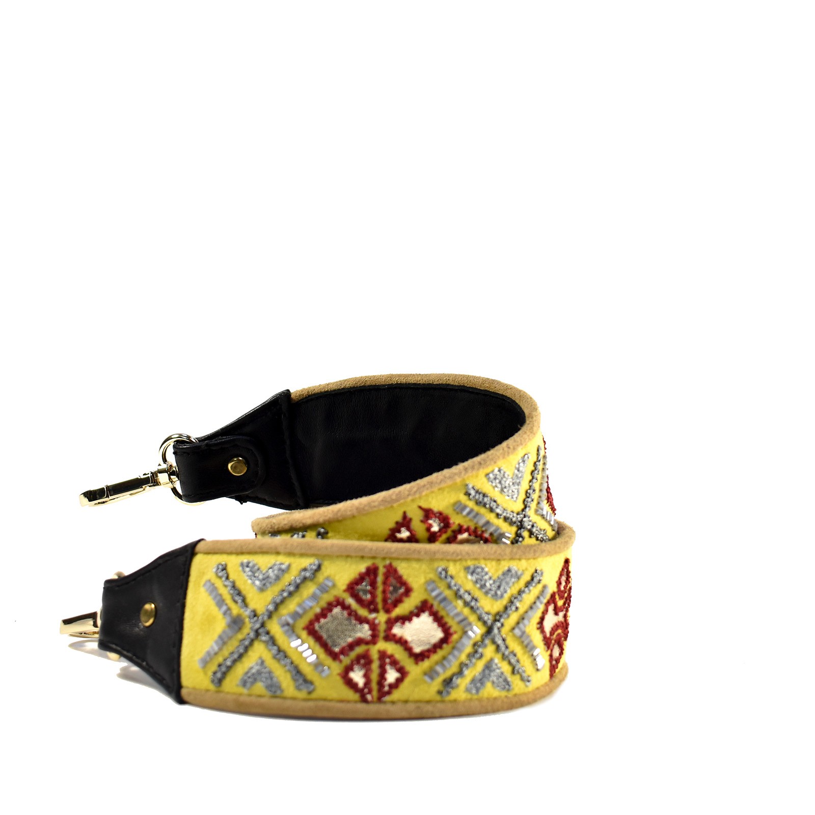 An embroidered bag strap crafted from deep purple suede, finished with traditional hand embroidery passed down from mothers to daughters. The geometric pattern brings colour and texture, while solid leather ends and metal dog clips make it practical and secure. Designed to refresh an existing bag or add character to a simple silhouette.