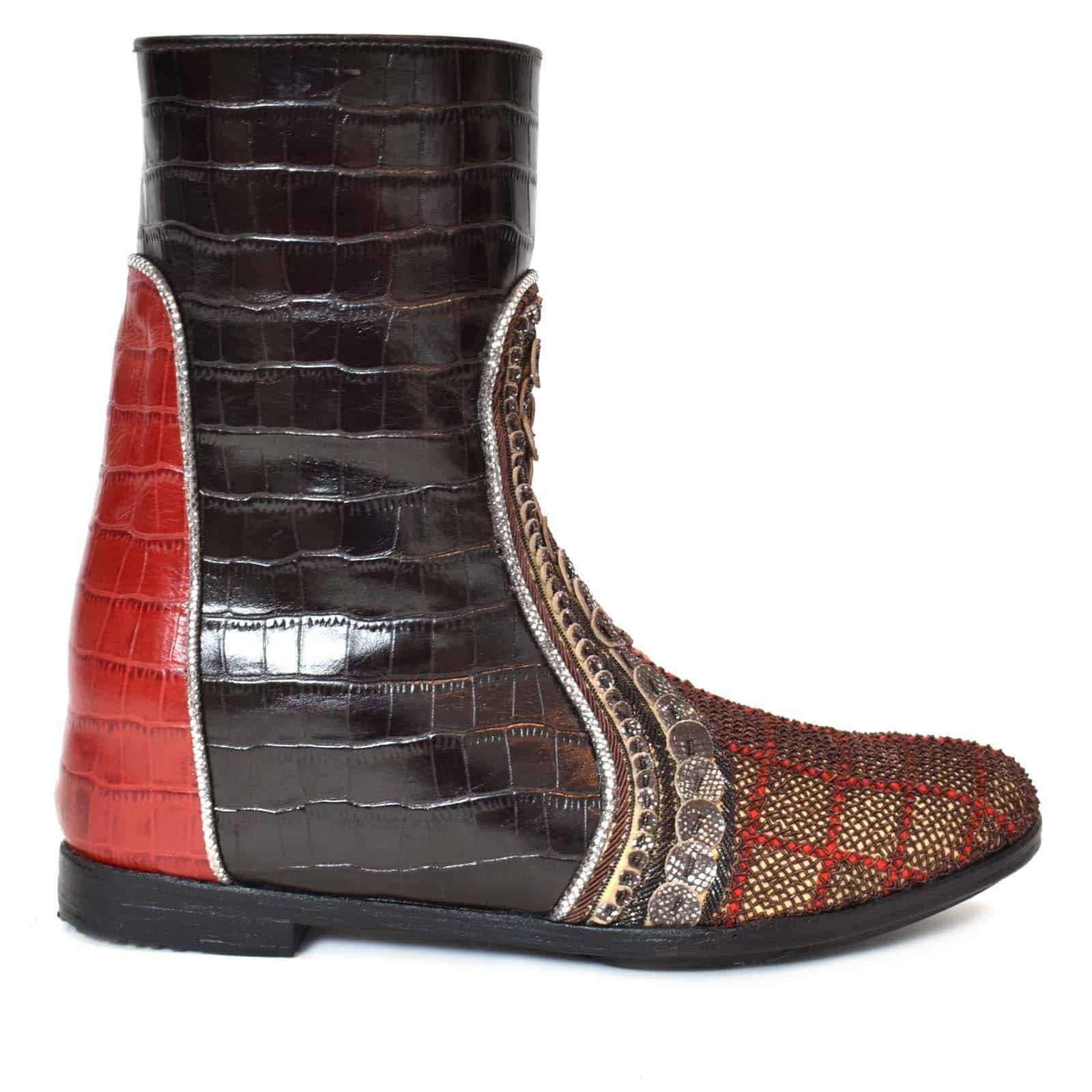 Red croc-embossed women’s ankle boots with a hidden inner wedge and a hand-embroidered front panel. Crafted for a refined fit and comfortable lift.