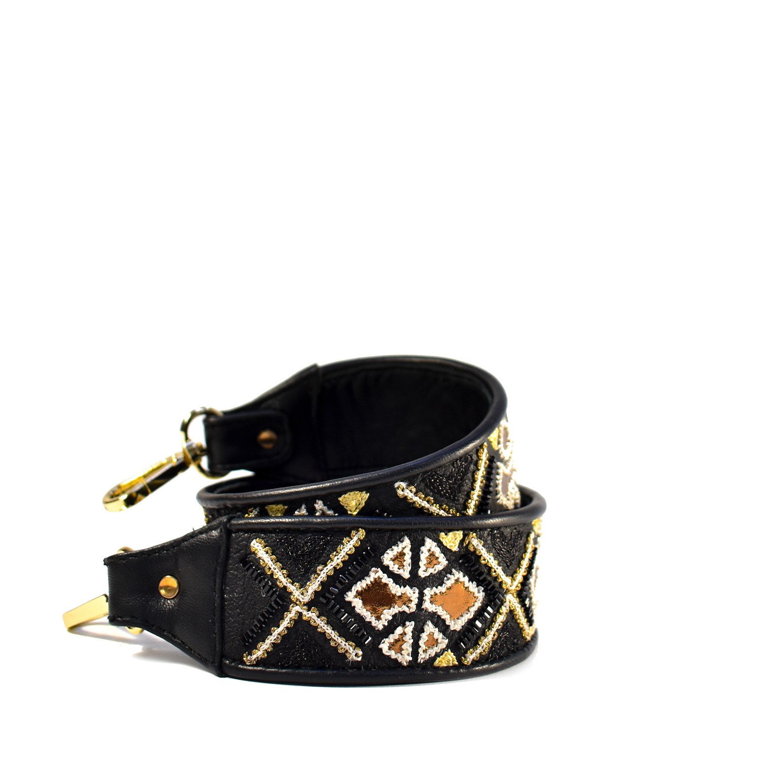 An embroidered bag strap crafted from deep purple suede, finished with traditional hand embroidery passed down from mothers to daughters. The geometric pattern brings colour and texture, while solid leather ends and metal dog clips make it practical and secure. Designed to refresh an existing bag or add character to a simple silhouette.